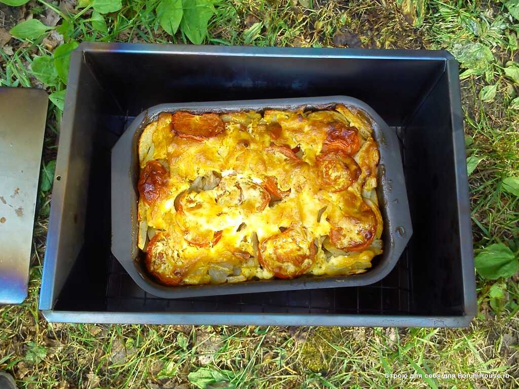 Ингредиенты - все, что есть под рукой: картошка, помидоры, мясо, рыба, курица. Делали даже из рыбных консервов и из тушонки. Готовят все по разному. Я всегда одним способом: на противень чуть масла, по стенкам рукой размазать, мясо (смесь из разного мяса, потрошки если есть, чем разнообразнее тем вкуснее), картошка, лук, помидоры, майонез или сметана, кетчуп по вкусу. Все слоями. В трубу на костер. 40 минут не подходим, не отвлекаемся, работаем. Собственно и все. У меня вместо трубы (пришлось оставить при разводе) прямоугольная коптильня-ящик из Ашана за 500 руб, начала уже прогорать, да и черт с ней, года 3 уже проработала, вполне нормально. Ветки вишни, рябины, смородины, груши - для ароматического акцента. Но не переборщить, а то горчить будет. Ягоды вишни случайно попали, как обломал ветку, так и обломал. Вообще забавно, что люди выковыривают именно картошку из блюда, а не мясо. Именно аромат блюда нравится.
