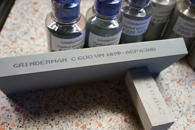 Приехал ко мне камень из карбида кремния - C 600 VM от Андрея из Санкт-Петербурга (ака Гриндерман). Размер 200х20х75, размер зерна по ГОСТу - М 10, по FEPA - 10,3 - 8,3 мкм. Связка керамическая. Твердость - М. Брал после разговора с Aptekar. Разговаривал еще с парой человек, но ножевиков с Ганзы упоминать не буду  Все пробовали камень на бритвах. Понравился всем. Взял для черновой обработки, взамен расколовшейся Нанивы. Камень твердый, воду пьет, но сохнет за секунду. Выглажен, по ощущениям, как трехтысячная Нанива. Надо передоводить на 600-м порошке. Суспензию свою почти не отдает. Чтобы поднять суспензию нагурой от Гуанси потребовалось минут 5 - 7. И то, скажем, не суспензия, а взвесь, подмешанная к взвеси Гуанси. Времени пробовать пока нет, вечером прошел несколько движений бритвой - съем сразу чувствуется. Работает мягко, не смотря на твердость. Посмотрим далее в работе, как появится время. Еще там же взял до кучи порошков. Удобная упаковка, не в пакетиках  А также бонусом - пара слуриков - 600 и 1000.