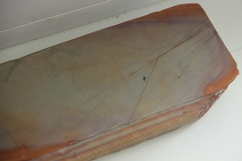 Очень красивый оттенок рабочей поверхности.На сухую, камень имеет приятный цвет Асаги, с едва уловимыми фиолетовыми кольцами по краям и коричневой окантовкой(типа Киита). При работе с водой, камень открывает ещё и зеленоватый оттенок и заметным проявлением фиолетового по краям.
