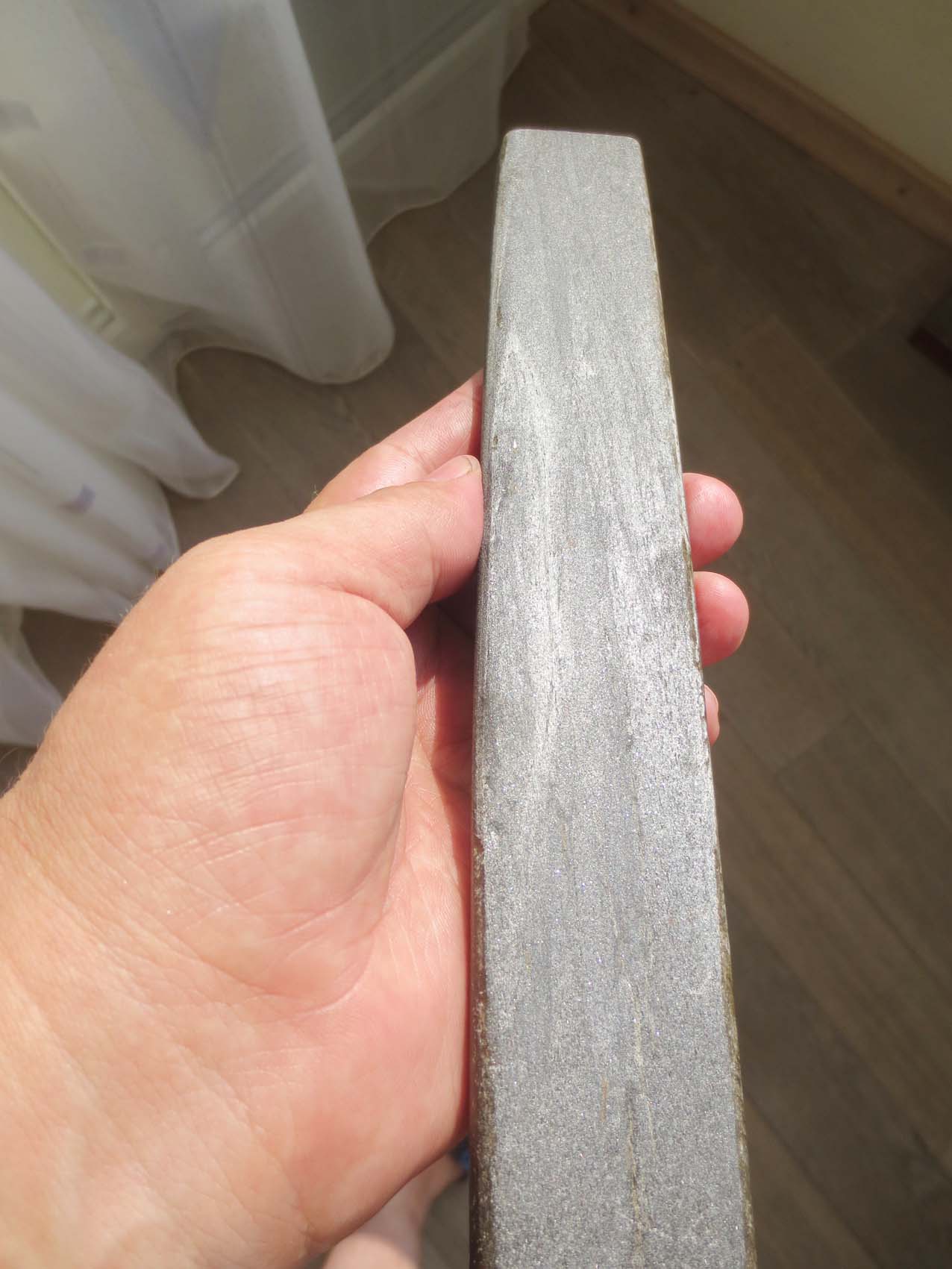 Приобрел по случаю на барахолке такой вот камушек 24х3,8х1,5 см. Мужик сказал, что остался от деда-ювелира, а там кто его знает.. На торцах треугольные скосы. Впечатление, что под зажим. Одну сторону выровнял - стало видно серебристые слои.. Какой-то сланец? Что за камень может быть и где использовался, может кто встречал такую форму? Spoiler Show Бесит, когда приходится пользоваться бритвой моложе себя...