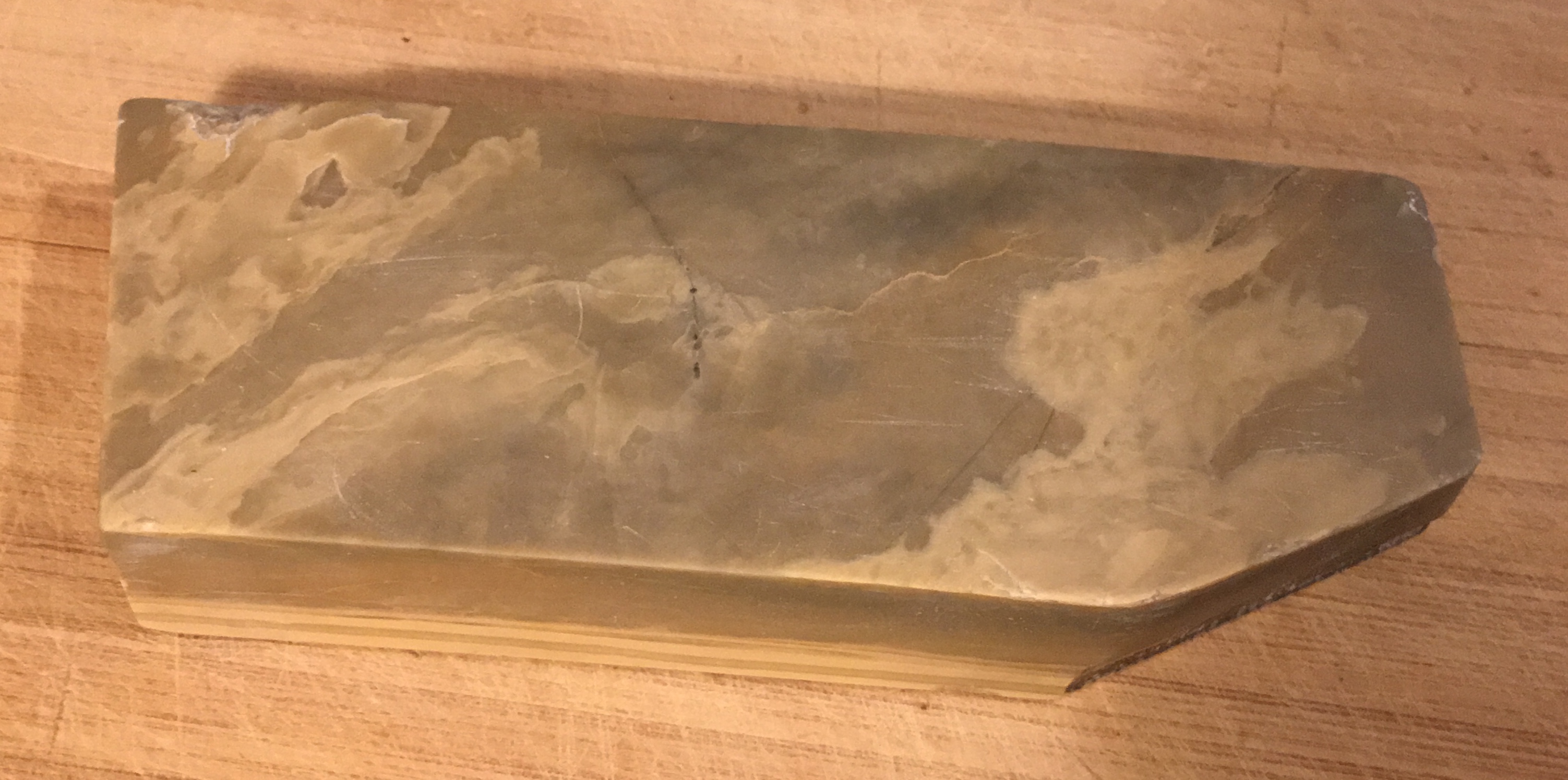 Такие разные бельгийские гранатовые сланцы.ну тут сама расцветка камня и характерные линии говорят о том, что это лавиньет. у меня похожий, только бритвенного размера. характерные линии на нем, разводы и местами розоватость... зарубежные форумчане говорят о том же, что подобные камни это лавиньет. то-есть не просто так, а именно этот слой они обзывают лавиньетом, а не, к примеру дрессанте или ла петит бланш... если кто-то называет свой камень лавиньетом, а он на самом деле ла петит бланш, то человеку на это указывают. если разговор о том, что впринципе невозможно их определить, потому как нет бирок или нет печатки с указанием карьера на камне...ну этого впринципе не делалось. по общепринятым понятиям их и классифицируют сейчас. как я думаю, нет смысла от этого отходить. по поводу скорости работы... я не согласен с тем, что пишут. в общем доступе информация по неким слоям частично не верна, потому как информацию о слоях ранних карьеров... ее смешали с описанием слоев арденесовских . по большей части лавиньет как раз таки очень быстрый на воде... умеренно-быстрый на суспензии (зависит от количеста розоватых оттенков и марганцовых прожилок или других минералов). дает отлично полированную кромку схожу с финишными японцами. еще добавлю.. соответственно, если камень однороднной расцветки, без линий и розоватости, то он как раз таки и будет умеренно точить, что на суспензии,что на воде.