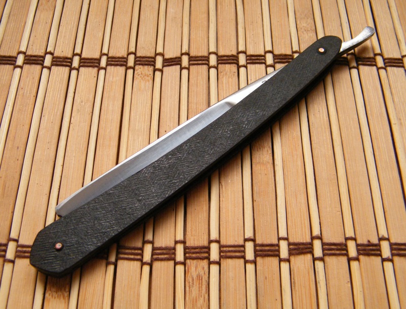 Бритва регулярно правилась на пастированном ремне, вследствие этого обратная улыбка (провал в середине лезвия). На мой взгляд полотно потеряло в ширину 1-1,5 мм. Чтобы привести в божеский вид у пятки и у носа также придется убирать 1-1,5 мм.