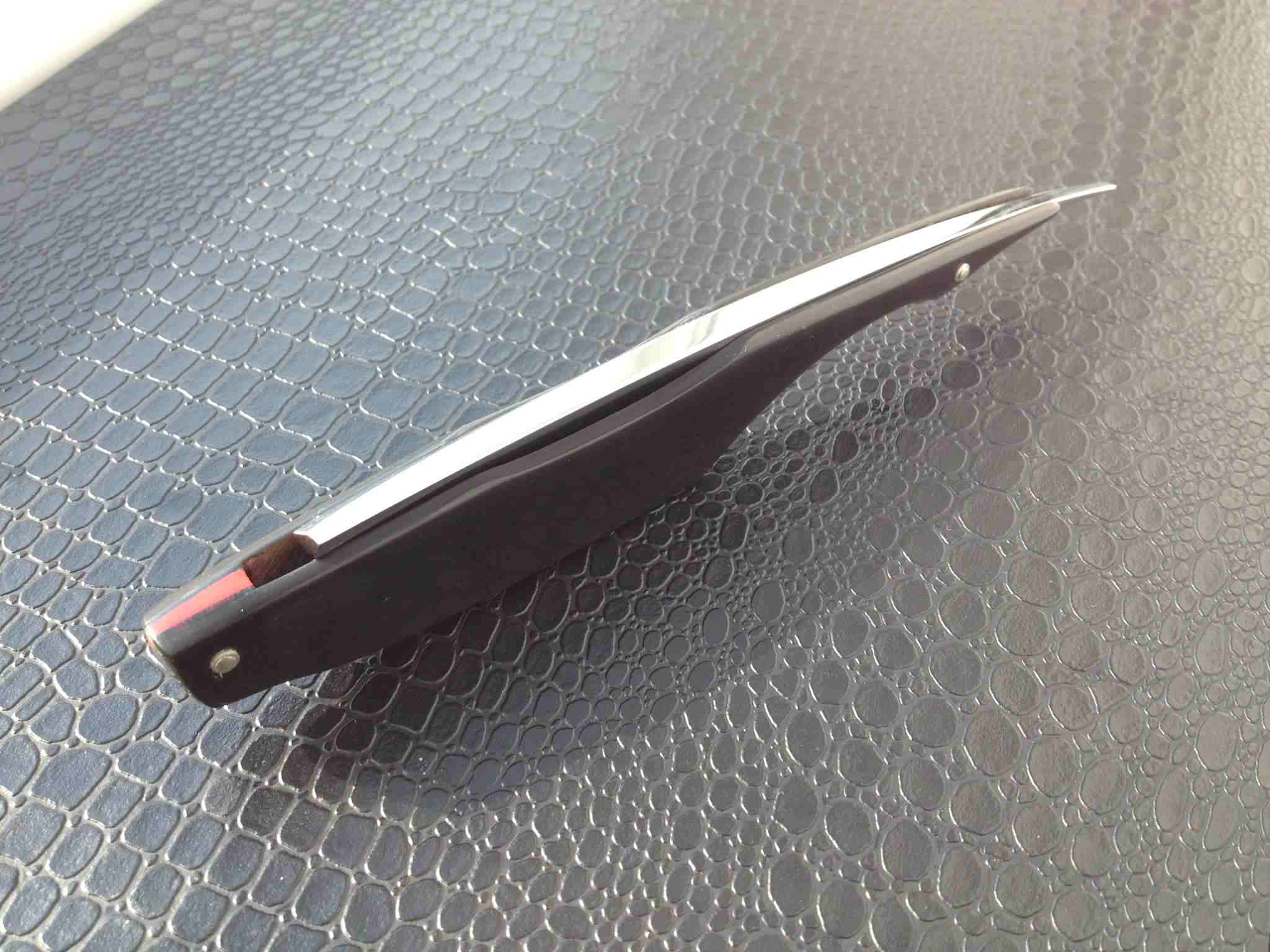 Побрился уже с приделанной ручкой - впечатления подтвердились - весьма остро, но щадяще, что вероятно говорит, о том, что помимо самой заточки на условно "камнях" была доработка на ремне с пастой На мой взгляд такое качество бритья говорит о том, что заточка была сделана замечательно, сталь / РК не имеет дискомфортных заусенцев, крошливости и прочего вот сейчас, как минимум (и визуально в МПБ3 это видно). Но, на мой взгляд, само качество стали и ТМО определится всё же несколько позже, через месяц где-то эксплуатации, наверное. Ручка - юма элфорин; Клинышек - олово; Пины - нейзильбер d1,6; Шайбы внешние - латунь из трубки (d1,7/3,0mm; h0,5mm), пунзельнутая на анке малёха:), внутр. - латунь d6mm, h0,2mm