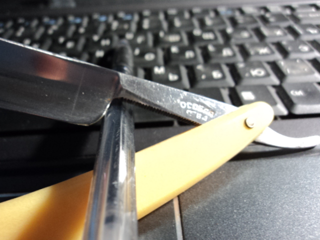 Уточили, причём по-варварски: бритва, судя по обуху, была улыбчивой, а режущая кромка уже прямая. Хотя... не разобрал, какой там год указан — 54-й, что ли? улыбчивых бритв тех времён что-то не припоминаю.