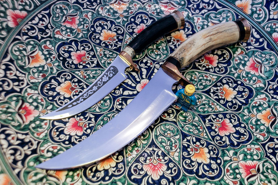 Re: Наши ножиВот бухарские ножи. Если пчак в основном имеет форму чтобы порезать порубить фрукты-овощи, то бухарский более агрессивен и может использоваться как колющее приспособление. Связана такая форма с тем что Бухара на торговых путях находилась, и нож был нужен для всех случаев жизни.