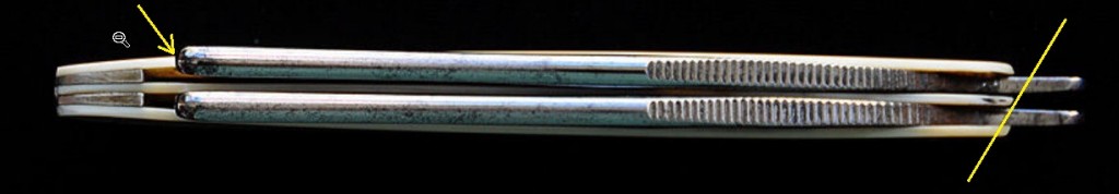 Re: Аукционы: плагиат, развод и "великолепные" описанияПосмотри на торцы плашек возле осевого пина. Средняя имеет такой же скос, как боковые, что намекает, что когда-то она тоже была боковой (т.е. к целой верхней бритве приделали нижнюю). В гипотезу "что было под рукой на фабрике, из того и собрали" верю с трудом, потому как если это все-таки слоновая кость, то это вещь дорогая и отношение к производству тоже было бы другим.