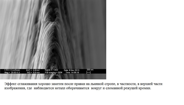 Re: Обострение на чистом ремнеВот именно, товарисч, хватит ПЫТАТЬСЯ теоретизировать, ибо обострение бывает у шизофрении в межсезонье, а не у металла. Все давно уже выложено в сети - и макросъемка кромки на электронном микроскопе, и описание тех. процессов. Если в кратце, то при правке на стропе (независимо от ее материала) происходит выравнивание режущей кромки, ОБЛОМ фольги и заусенца, сглаживание рельефа после камней путем пластической деформации металла, т.е. фактически кромка после ремня имеет бОльший радиус скругления, нежели после камня, значит становится тупее. Но комфортнее для бритья.