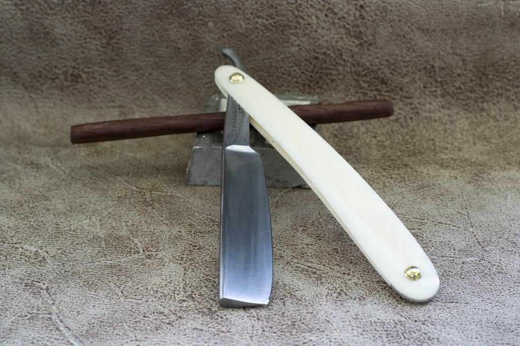 Опасная бритва конца 19 века из качественной углеродистой стали, производства Франции. На бритве не было найдено следов использования, тем не менее произведена реставрация с целью удаления незначительных следов времени. Родная рукоять была заменена на новую из кости верблюда. Ширина полотна 19.8 мм. Спинка 4.8 мм, вогнутость 3/4. Бритва заточена и готова к бритью. Отличный вариант как для новичка так и для продвинутого пользователя, желающего попробовать старую французскую бритву. Продано. Spoiler Show