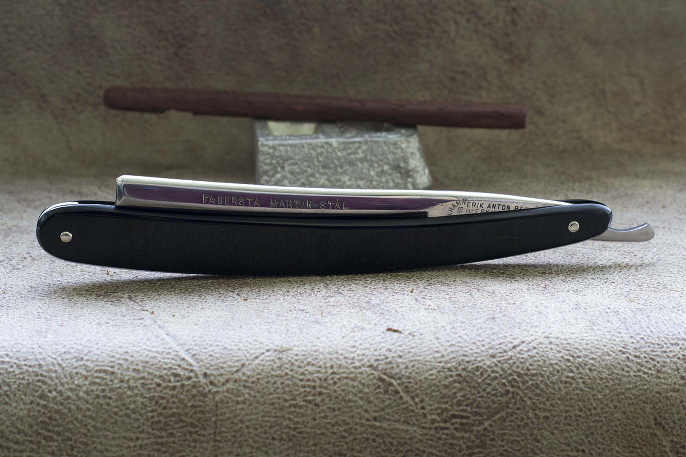 Опасная бритва от именитого шведского производителя, изготовлена из так называемой Fagersta Martin Stal - Мартеновская Сталь полученная в местечке Fagersta. Фагерста была местом производства стали в центральной Швеции, начиная с 17 века. Как понятно из надписей на эрле - производитель неоднократно удостаивался наград за свою продукцию на индустриальных выставках в Швеции, в частности на бритве есть упоминание о Золотой медли на выставке в Стокгольме в 1897 году, на спинке так же есть данные о патенте. Бритва имеет ширину в 6/8 дюйма в самом широком месте (18.8 мм) Бритва не была в использовании, имеет отличную геометрию. Мною проведена разборка, полировка полотна и заточка. Бритва полностью готова к бритью. Сталь полотна гораздо тверже стали обуха, поэтому бритва заточена с изолентой. Бритва годится для новичка, но так же предпочтительная для коллекционера. Старые шведские фреймы с таким количеством пояснительных клейм являются довольно редкими. Продано Berg Show