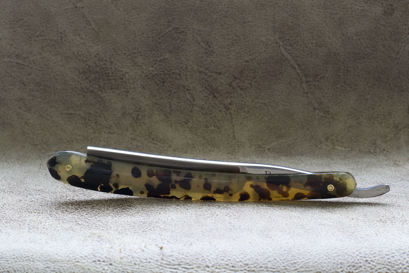 Английский Бенгалл времен Томаса Рэдли Кадмана. Рукоять из рога, протравленного под черепаху, родные латунные шайбы, ширина полотна 5/8 дюйма, клин. Период изготовления конец 19 - начало 20 века. На бритве были некоторые следы от камня на обухе и кромке, я считаю это заводской заточкой, кромка не была сведена и бриться с такой заточкой было невозможно. По сути это NOS бритва, по моим заключениям не находившаяся в использовании. Состояние полотна великолепное, заводской сатин,который намного грубее того что можно встретить на более современных бритвах, видна грубая риска от камня, полотно отполировано мной вручную. Бритва заточена и готова к бритью. Продано Spoiler Show