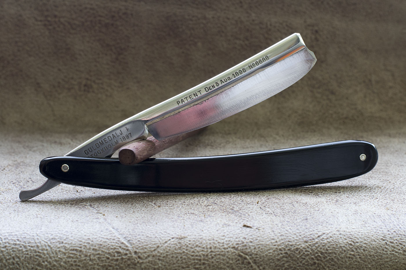 Опасная бритва от именитого шведского производителя, изготовлена из так называемой Fagersta Martin Stal - Мартеновская Сталь полученная в местечке Fagersta. Фагерста была местом производства стали в центральной Швеции, начиная с 17 века. Как понятно из надписей на эрле - производитель неоднократно удостаивался наград за свою продукцию на индустриальных выставках в Швеции, в частности на бритве есть упоминание о Золотой медли на выставке в Стокгольме в 1897 году, на спинке так же есть данные о патенте. Бритва имеет ширину в 6/8 дюйма в самом широком месте (18.8 мм) Бритва не была в использовании, имеет отличную геометрию. Мною проведена разборка, полировка полотна и заточка. Бритва полностью готова к бритью. Сталь полотна гораздо тверже стали обуха, поэтому бритва заточена с изолентой. Бритва годится для новичка, но так же предпочтительная для коллекционера. Старые шведские фреймы с таким количеством пояснительных клейм являются довольно редкими. Продано Berg Show