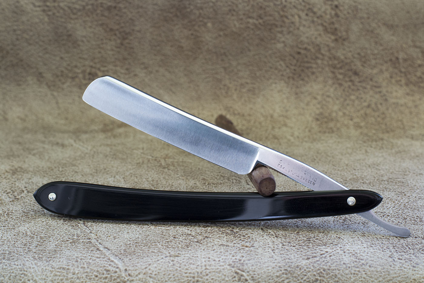 Шведская бритва от пожалуй самого известного производителя в Швеции. Бритвы сделаны для продаже во Франции в магазине Магнуса Киндала о чем свидетельствует надпись а полотне. Ширина 6/8, вогнутость - почти клин. родная рукоять из целлулоида, отличная геометрия. Бритва заточена и готова к бритью, прекрасно подойдет для новичка. Продано. Spoiler Show