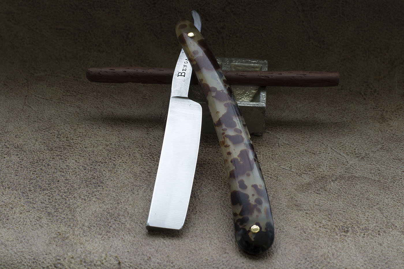 Английский Бенгалл времен Томаса Рэдли Кадмана. Рукоять из рога, протравленного под черепаху, родные латунные шайбы, ширина полотна 5/8 дюйма, клин. Период изготовления конец 19 - начало 20 века. На бритве были некоторые следы от камня на обухе и кромке, я считаю это заводской заточкой, кромка не была сведена и бриться с такой заточкой было невозможно. По сути это NOS бритва, по моим заключениям не находившаяся в использовании. Состояние полотна великолепное, заводской сатин,который намного грубее того что можно встретить на более современных бритвах, видна грубая риска от камня, полотно отполировано мной вручную. Бритва заточена и готова к бритью. Продано Spoiler Show