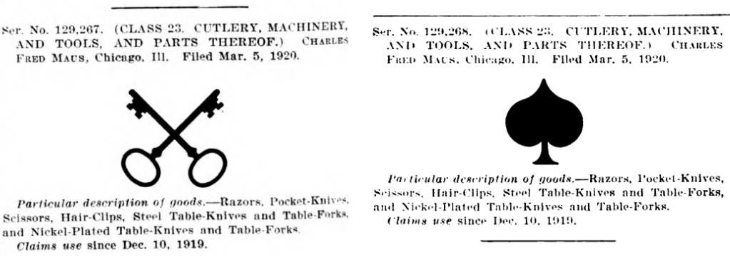 и правда, с 1919 года "пиковая масть" и "скрещенные ключи" принадлежали фирме Charles Fred Maus, Chicago, бритвы, складные ножи, машинки для стрижки, ножницы, столовые ножи и вилки.