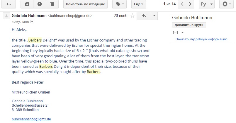 Re: Куплю желто-зеленый тюрингский сланец, хороший и недорогСпросил я Buhlmann про камень из той темы со страницы сайта продажи, почему он использовал в описании "Barbers Delight". Ответ пришел не от Питера, а от Gabriele Buhlmann. Сначала о том, что "Barber Delight" использовалось компаниями для продажи, а потом утверждение в последнем предложении, с которым я не согласен, о том, что название "Barbers Delight" стало использоваться для всех двухцветных камней. Buhlmann молодец, потому что написал на форумах много информации по этим камням с фактами, с каталогами, сканами книг, но вот это обозначение "Barber Delight" для камней без этикетки я увидел впервые на сайте его продаж. Это как обычно продают такие вещи- мол осталось от старого парикмахера, мол дед все время на нем бритву правил, мол трофей и все в таком духе, сказки не имеющие оснований. На качество камня они не влияют.