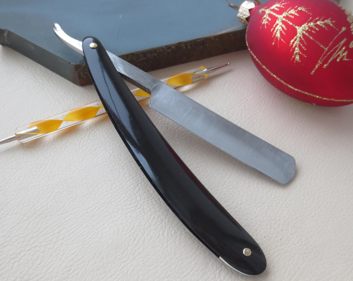 родина знаменитых точильных камней - кутикулов...) Опасная бритва Emmanuel Gervais Anvers #59. Производитель имел патент армейского поставщика. Произведена в самом начале 20 века, ширина клинка - 17мм, характерная французская оголовье лезвия, ручка - ударопрочный пластик, заклёпки - латунь. Небольшие следы времени, характерные для бритв такого возраста, не выходящие на режущую кромку и абсолютно не мешающие эксплуатации данного инструмента. Тестировалась лично, бреет исключительно. Бритва заточена, направлена и полностью подготовлена брить, брить и брить... После заточки продезинфицирована и не использовалась. Родной пенал в наличии. Цена клинка - 4800 руб. При покупке ремня и бритвы - бесплатная доставка по РФ. Не забываем про подарки на Новый Год себе любимым или дорогим вам людям...) Anvers Show ЧЧ Show