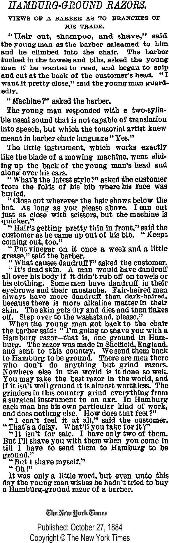шеффилдские компании одно время отправляли в гамбург бритвенные лезвия для шлифовки/заточки (grinding), а не для захвата рынка. перевод абзаца из статьи, отсканированной МорфеУсом: когда молодой человек вернулся в кресло цирюльника, тот сказал: Я собираюсь побрить тебя гамбургской бритвой - да-да, именно бритвой, заточенной в Гамбурге. Сама бритва была сделана в Шеффилде, в Англии, и отправлена в эту страну (имеется в виду США - прим. мое ) . Мы же шлем их в Гамбург, чтобы их там как следует заточили. Там есть ребята, которые только и делают, что точат бритвы. И нигде в мире не делают это лучше них. Через их руки проходит все - от скальпеля до топора. В Гамбурге каждый делает свою часть работы - и делает это на все сто! Ну как тебе? - Просто превосходно! Я хочу купить у вас эту бритву. Сколько это будет стоить? - Она не продается. У меня их всего две. Но я могу брить тебя, пока мне не придется снова отправлять их в Гамбург для заточки. - Но я бреюсь сам, дома. -Упс...