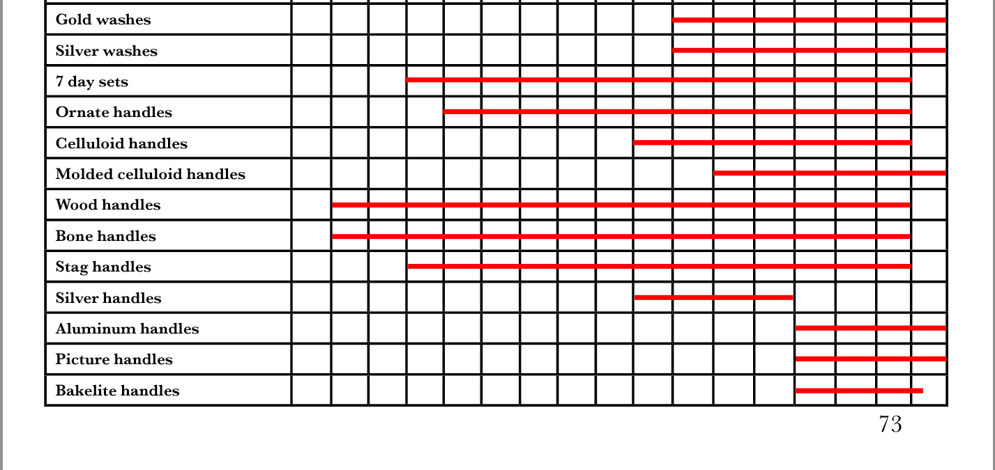 Есть книжка умная STANDARD GUIDE TO RAZORS. http://oldrazor.ru/books/STANDARD%20GUI ... RAZORS.pdf Там таблица любопытная по датировке бритв. Вот по комплексу признаков можно определить примерную дату изготовления бритвы. Там и форма клинка, и вогнутость, и длинна хвостовика с формой, и материал оправы, и много еще всего. А создана таблица на основе исторических данных. Добавлено спустя 45 секунд: Книга кстати у Кая в библиотеке. Спасибо ему. 32 года активно мусолю харю клинковой бритвой