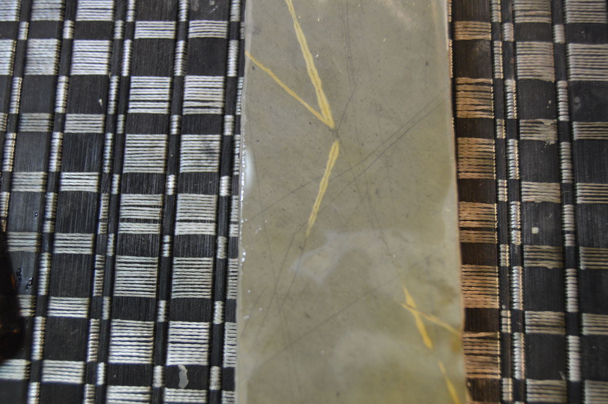 Re: Продаётся от artemarut1Spoiler Show Японский финишный камень, асаги с желтыми кольцами (кан) и микро черными точками типа нашиджи, на лицевой стороне два штампа, один виден едва, второй просматривается полностью, есть пара штампов с торцов. Твердость у камня 5+ , суспензии своей не дает, можно сказать вечный. На фото и видео состояние камня на данный момент. Размер 150/87/24мм в максимальных измерениях. В общем могу сказать "отборный финишный камень для бритв без каких либо включений и трещин". Цена Продан с доставкой по России.