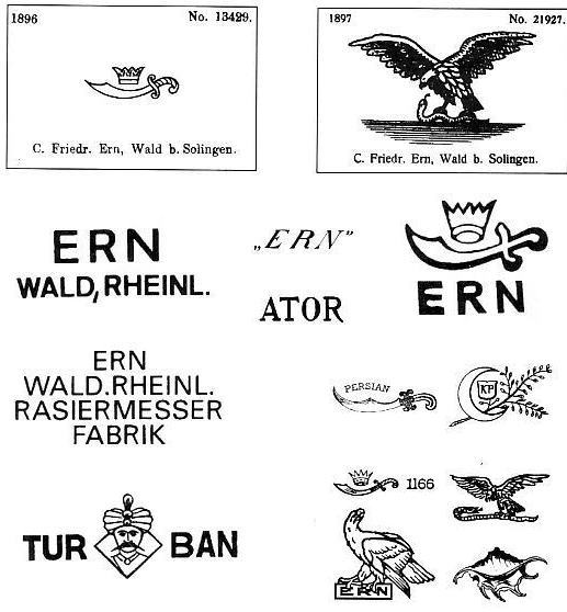 Торговые марки: ERN (1896 No.19889), Protector (1897 No.21043), S ESSEX (1898 No.29038), BARBERS PET (1898 No.29634), Primus (1903 No.60076), ATOR (1903 No.60972), The Crown and Sword Razor (No. 109223), Army and Navy, America del Sud, Balance, Bank, Bar, Barden, The Boss, Bur, Cuba, Electro Taban Magnetic, Ern A.-Z., Ern 1166, Ernovo, Em Junior, Ernette, Es-Ex, Farwood, Flaggen, Generale Ameglio, Gong Razor, Gorki, Janissaire, Junk, Justrite, Ka. Ci. Be., The Kid, King George, Knight Commander of the Bath, Kuroki, Laborista, Le Mondain, Lerne, leiste, Liliput, Little Dorrit, Master, Master of Arts, Master of Science, The Michaelin, Mickiewicz, Mignon, Moustafa Kemal Pascha, The Mussel Razor, Niazi, Nodzu, Oxama, Palmerston, Peer, Perfecto, Persian, Platypus, Put, Raccoon, Roosevelt Razor, Ski, Strandbad, Schwert (sword), Sim-Mart, Suneo, Turban, Tur-ban, Waldern, Waldoo, Wee Macgreggor, Zeibek, Zepp, Barbersone, Bessimar, A. v. Humboldt, А.Newton & Sons A.D.1786 (1910-1912), Craftsman, Nohon
