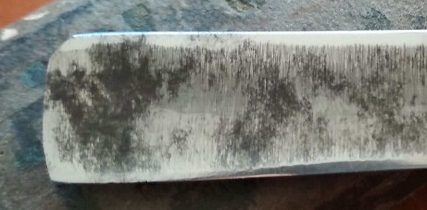На фото видно, что драли клинок на наждаке нещадно с отпуском стали. Недодрали, т.к. сколы у мыска остались, потом линзовали на узком ремне с ГОИ, т.к. линза бликует.