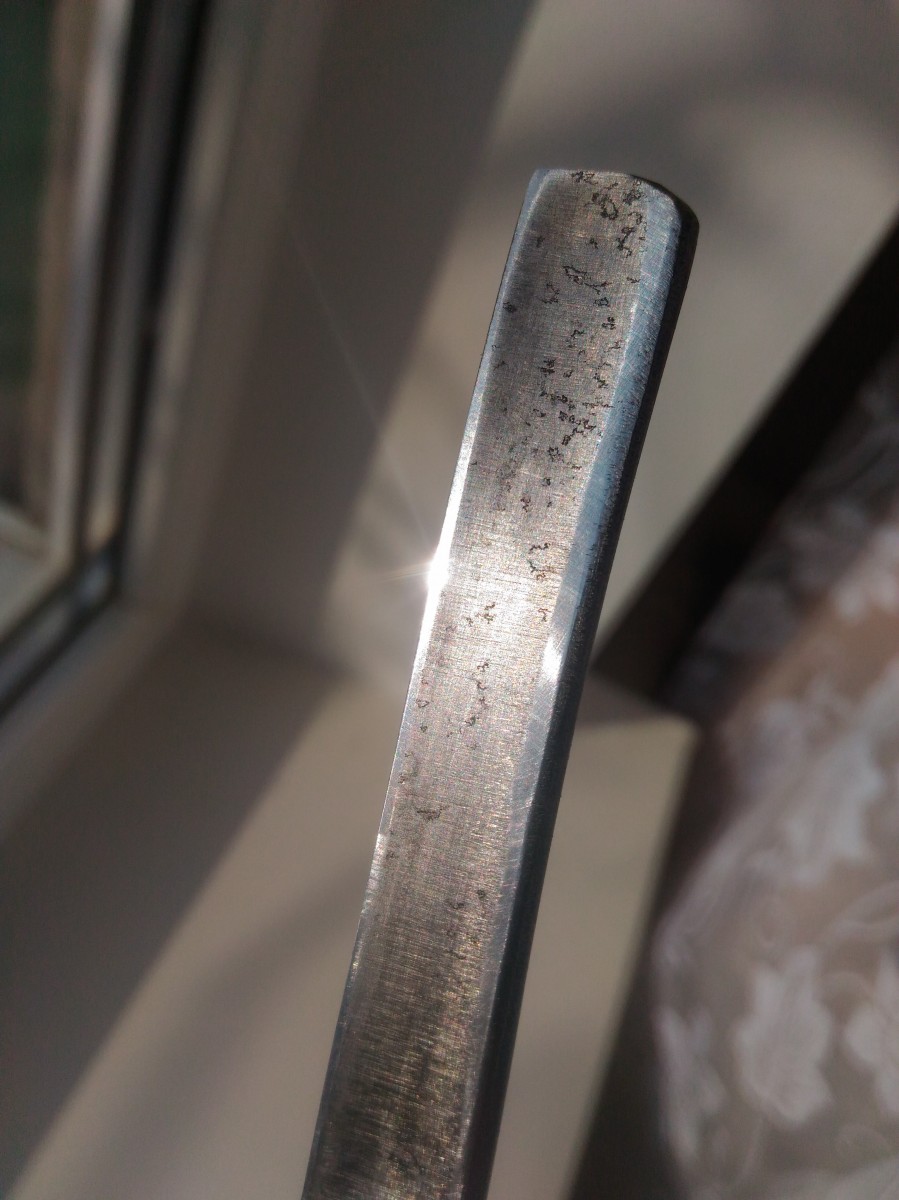 Re: Помогите разобраться в камняхА вот, нате, пожалста Итак, убрал все камни крупной шершавости,начал с помеченного синей стрелкой - он ровный и не слишком грубый. Сбил кромку на нем. Потом перешел на помеченный красной стрелкой, этот почти гладкий и твердый. Все с добавлением воды конечно. После начал полировать на ремне с пастой ГОИ. Готовность бритвы проверял бритьем волос на руке. Сначала брить начала поверхность ближе к хвостовику, потом носок и после уже серединка. Это нормально или что-то не в порядке с геометрией бритвы? Побрил пока левую ногу до колена