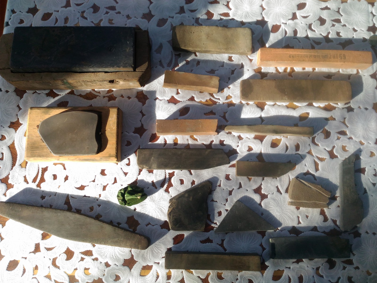 Помогите разобраться в камняхДоброго времени! С недавних пор заинтересовался бритьем опасной бритвой. Нашел старую дедову бритву, попробовал сбрить волосы на запястье - не бреет. Нашел в гараже целую кучу дедовских абразивных камней, но они никак не подписаны, какой в начале, какой в конце идет не понятно. Надо сказать, что дед всю жизнь был столером и таки знал толк в заточке стамесок и рубанков. Может кто по фото сможет определить и подскажет, как ими точить и в какй последовательности