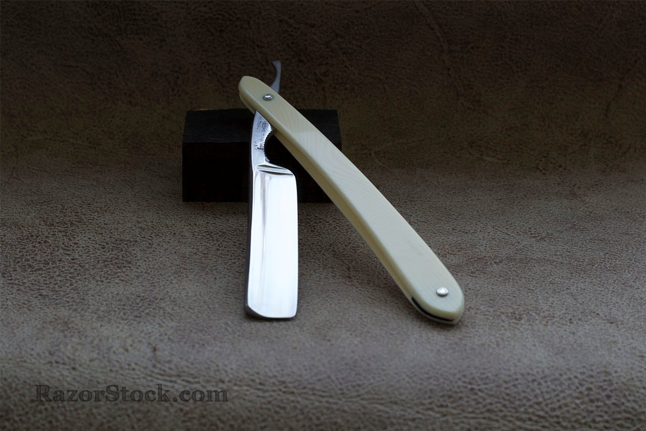 Немецкая опасная бритва из города Золинген (Solingen). Бритва произведена в 20-40 годах 20 века . Вогнутость 3/4, ширина полотна 15 мм. (5/8), спинка 4 мм. Имеет родную рукоять из целлулоида, никогда не была в использовании, поступила ко мне с заводской заточкой, была переточена и подготовлена к бритью. С бритвой решил ничего не делать, оставил на полотне некоторые следы времени, родные пины без шайб менять не стал, так как эрл бритвы чистый. Отполировал полотно и рукоять вручную и заточил. Готова к бритью. Рекомендую новичкам в качестве первой бритвы, так же годится для окантовки бороды. Продано. Spoiler Show