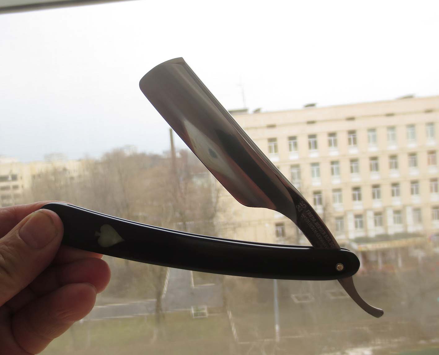 F. Herder Abr. Sohn N°172, 6/8. Досталась много лет назад на барахолке в грустном состоянии с побитой целлулоидной рукояткой наихудше возможного золингеновского дизайна.