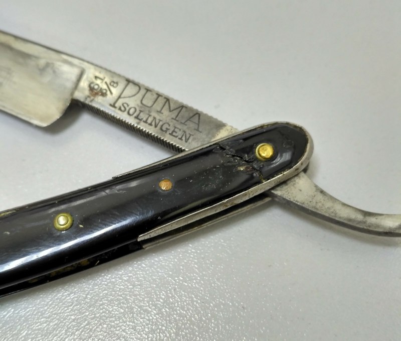Принес тут товарисч, решивший избавится от раздражения после бритья кардинальным способом, две бритвочки - дедовского СТИЗа и прадедовскую Пуму. Стиз то только почистить-заточить, а вот Пума достойна восстановления для потомков. Вопрос в чем - ручка Пумы с трещинами, буквально расколота (видно по фото). Но она в металлической оправке, вот как бы новую ручку да аккуратненько в эту же оправу вставить? Улыбайтесь!
