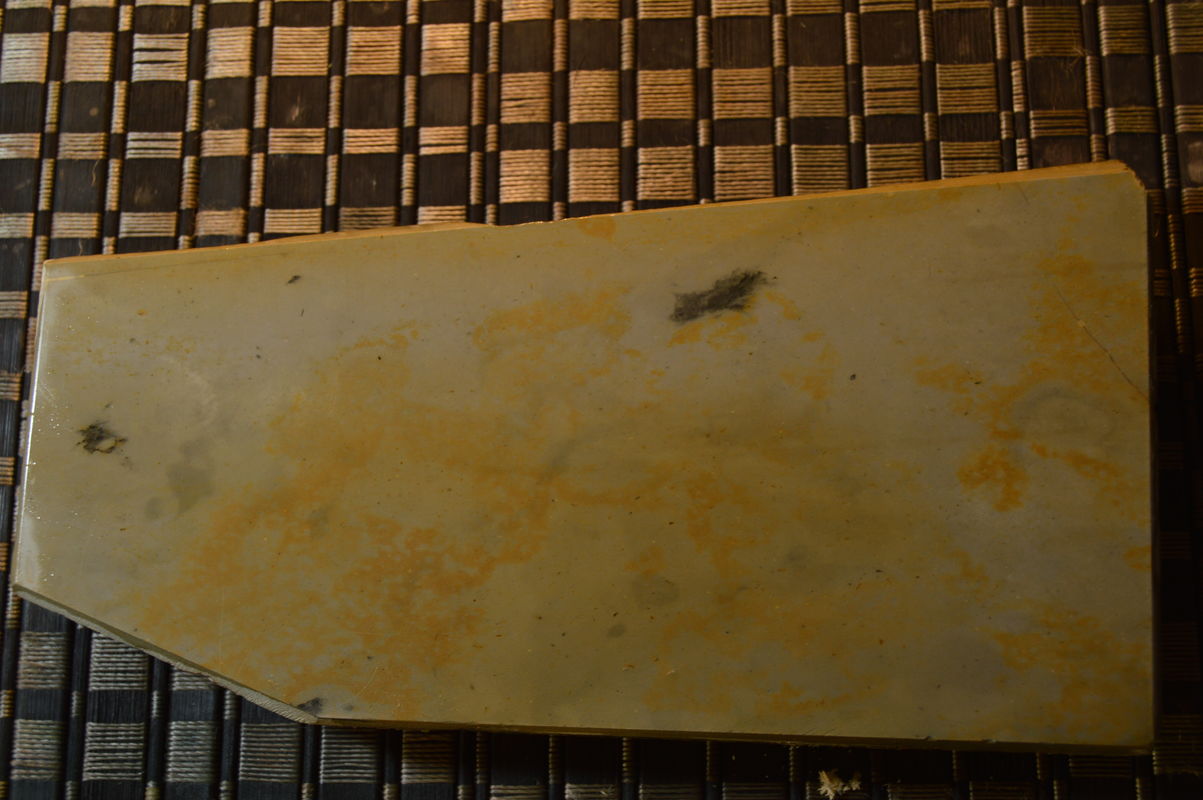 Re: Продаётся от artemarut1 Бритвы Камни РемниSpoiler Show Продам в ответственные руки японский атрибутированный камень Нашиджи, чистый, никаких линий, гритность финишная, зеленоватый цвет камня разбавлен желтым(не смог в точности сфотографировать цвет, в живую ощущения что камень живой). Камень очень быстрый и твердый (около 5-5+), видимо долго хранился(японцы не церемонятся и держат камень на камне) и остались коцки на лицевой поверхности, прилагаю доп. фото(см.выше под спойлером). Размер 153/84/29мм. Цена 20000р Камень притерт с тыльной стороны, можно сохранить печати закрасив прозрачным лаком. Коцки на лице самое большее около одной третьей милиметра в глубину Spoiler Show
