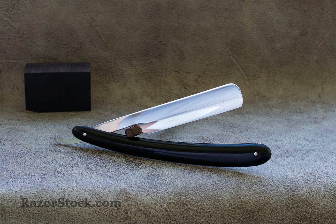 Бритва находится в прекрасном состоянии, мощный, тяжелый английский холлоу граунд в лучших своих традициях. Вогнутость полная, ширина 21 мм, (13/16) спинка 6мм. Бритва либо совсем не была в использовании, либо точилась очень мало и аккуратно, я не заметил никаких изменений геометрии вызванных заточкой. Заточена и готова к бритью, прекрасно проходит тест на рез волоса. Старая роговая рукоять была заменена на новую из рога буйвола. Бритвы от Джорджа Джонсона можно отнести к числу редких бритв из Англии. Фирма просуществовала с 1815 года и приблизительно до 1905 года, причем последние годы торговой маркой владел Артур Ламберт а не представители семьи Джонсон. Период времени когда фирма производила бритвы был намного короче периода ее существования, поэтому можно наблюдать следующую картину - встречаются либо очень старые в плохом состоянии бритвы от Джордж Джонсон, либо нечто сточенное или малопригодное для использования. Продано Johnson Show