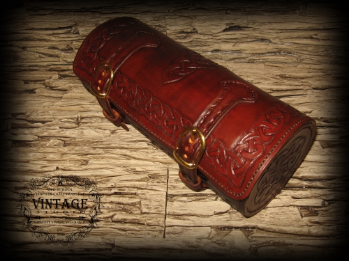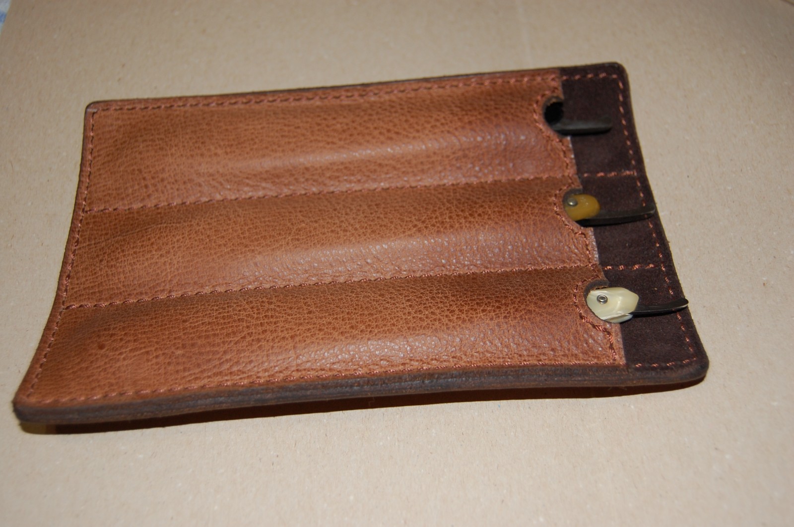 ...Пошил добрый человек из кожи вот такую походную шнягу на три посадочных места... В случае чего - можно трубочкой свернуть и в карман/вещмешок сунуть, а так - стоИт в ванном шкафчике у стеночки вертикально...