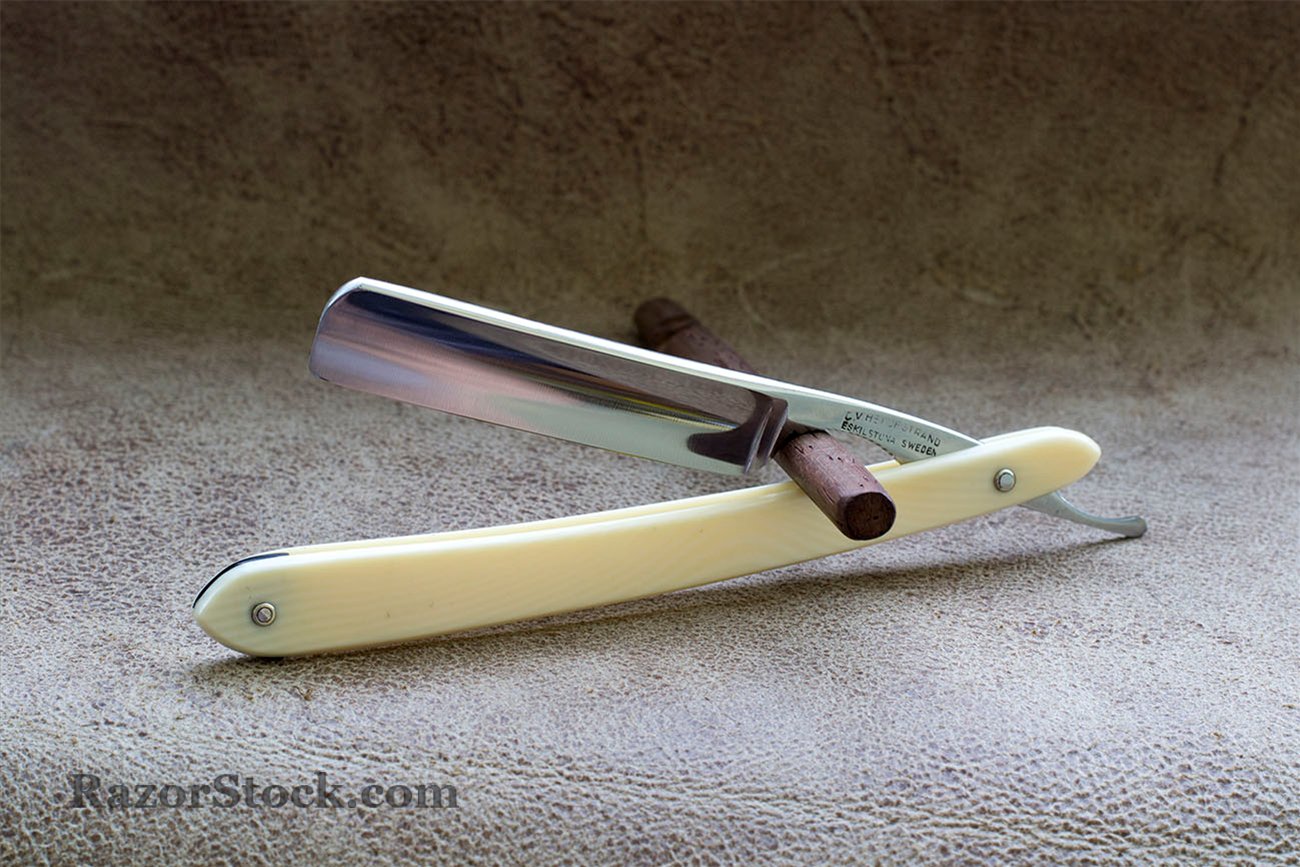 Бритва от самого известного шведского производителя C.V. Heljestrand. Компания Карла Виктора производила бритвы, ножницы и другие промышленные изделия из стали. Но для нас сам Карл Виктор известен как человек ставший одним из основоположников бритвенного производства в Швеции. Бритвы C. V. Heljestrand отличаются свойственным именно им дизайном, некоторые дорогие модели имели черепаховые или слоновые рукояти, кроме того, все, даже самые дешевые и простые модели, как правило, обладали прекрасной геометрией и отличным качеством стали. Бритва не была в использовании, были проведены некоторые работы по удалению следов времени, так же была произведена заточка. Отличная геометрия полотна, родная рукоять из целлулоида, в комплекте родная картонная коробка. Продано Spoiler Show