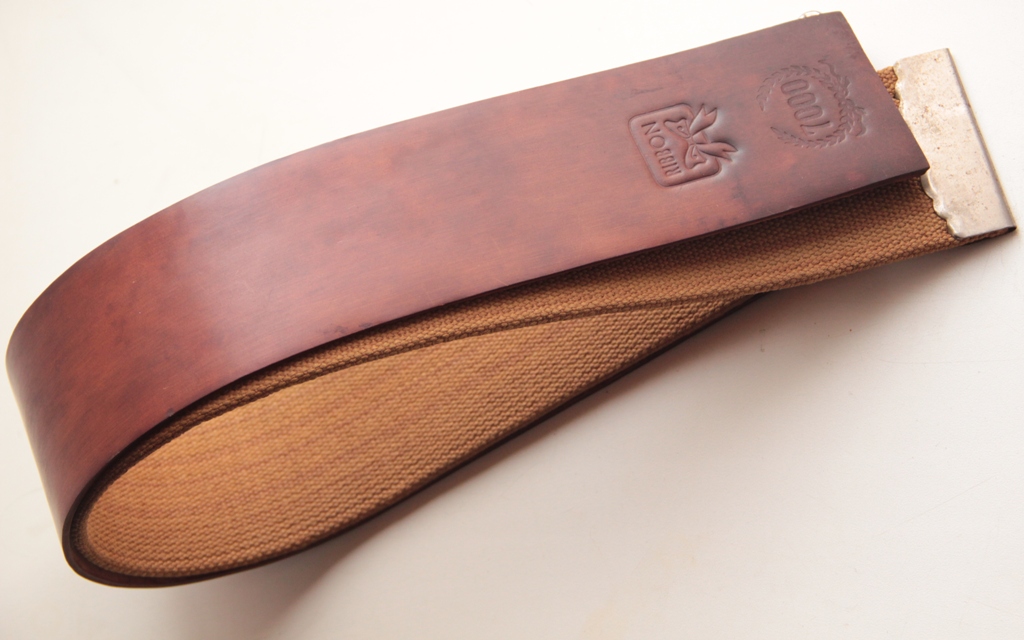 Ничего с ремнём не делал: не шлифовал шкурками и не полировал. Единственно что, очистил поверхность ремня пеной для кожи и всё. Вторая часть стропы-льняной холст-также, в прекрасном состоянии. Его не стирал и ничего с ним не делал.