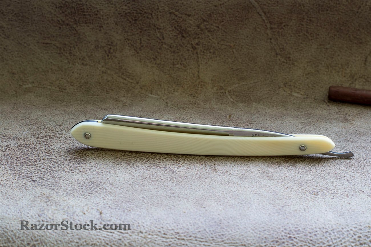 Бритва от самого известного шведского производителя C.V. Heljestrand. Компания Карла Виктора производила бритвы, ножницы и другие промышленные изделия из стали. Но для нас сам Карл Виктор известен как человек ставший одним из основоположников бритвенного производства в Швеции. Бритвы C. V. Heljestrand отличаются свойственным именно им дизайном, некоторые дорогие модели имели черепаховые или слоновые рукояти, кроме того, все, даже самые дешевые и простые модели, как правило, обладали прекрасной геометрией и отличным качеством стали. Бритва не была в использовании, были проведены некоторые работы по удалению следов времени, так же была произведена заточка. Отличная геометрия полотна, родная рукоять из целлулоида, в комплекте родная картонная коробка. Продано Spoiler Show