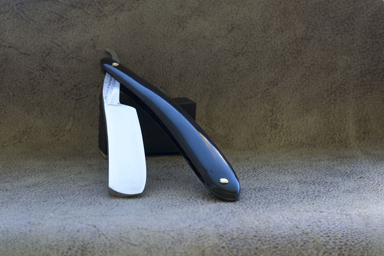 Опасная бритва от шеффилдских братьев Гилберт. Производство основано в конце 1830-х годов, но этот экземпляр скорее всего был выпущен в 60-70-х годах 19 века. Рукоять из эбонита, вогнутость 3/4, отличная геометрия. Бритва попала ко мне с незначительными следами заточки и практически без каких либо следов времени. Я лишь немного освежил полотно, отполировал рукоять и произвел заточку. Бритва довольно массивная - максимальная ширина полотна 21 мм, (13/16) .Спинка 5.8 мм. Отлично дополнит любую коллекцию, так как бритвы от братьев Гилберт довольно редкое явление, кроме того может с успехом использоваться новичком. Заточена и готова к бритью. Продано Spoiler Show