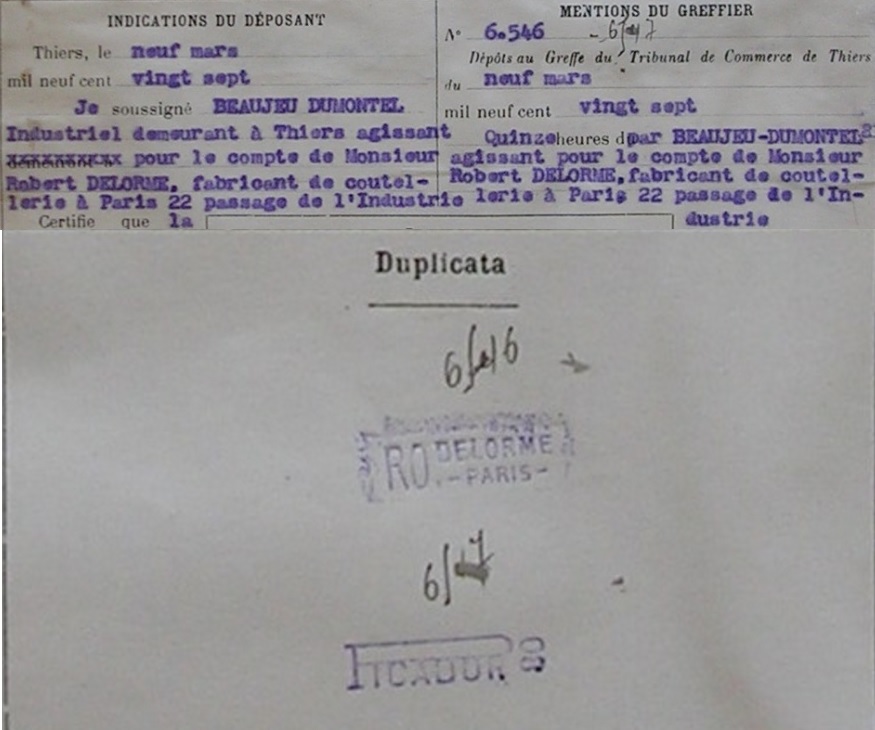http://www.delorme.fr" onclick="window.open(this.href);return false; - "Всё для профессионалов, парикмахерских и салонов красоты" На сайте о свой истории почти ничего не пишут, только общие фразы: "Мы уже более 100 лет на парикмахерской службе. В то время мы продавали опасные бритвы, маникюрные ножницы, шампуни, мыло, масло для волос и бороды. Клиенты были в основном работники парикмахерских." Сейчас это большая фирма, 500 000 евро уставной капитал, два филиала, занимаются тем же и находятся по тому же адресу. Вот их реклама того времени, 1933 год: Бритвы, конечно же, делали не сами, а размещали заказы в Тьере. Picador, 1927 год. В регистрационном листе написано: Регистрация торговой марки: Я, нижеподписавшийся, Beaujeu-Dumontel, промышленник и гражданин Тьера, действую от имени Robert Delorme, из Парижа, улица passage de l'Industrie, 22. Beaujeu-Dumontel это владелец большого завода по производству бритв: Всего, по такому поручению, на имя Beaujeu Dumontel было зарегистрировано 14 торговых марок: в 1924 году: THE STARTER, CRISTAL, L'INDUSTRIE ROYALE, Le Petit Parisien, EXTRA DRY, SUPER SALOON, PRIM'RAZ, VICTORY, Tout va bien в 1927 году: PICADOR 80 RO DELORME PARIS - основная марка, которая ставилась на эрле в 1928 году: DIXI, TITUS, CHARLESTON Spoiler Show Но не только Beaujeu Dumontel выпускал для них бритвы. Вот бритва выпущенная фирмой Thiers Issard: Возможно выпускал и кто-то еще. На ранних бритвах ставилось клеймо "R. Delorme Paris" Ну, а сам Robert Delorme (поставщик для парикмахерских), основатель фирмы, умер 6 декабря 1943 года. Вот найденный некролог: Re: Robert Delorme, Parisнесколько фоток бритв в коллекцию: