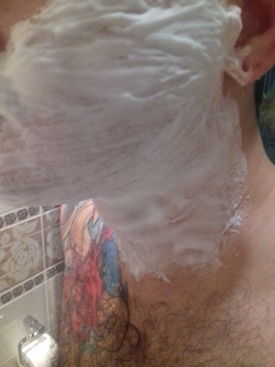 Решил вспомнить про это мыльце и сегодня достал с ним кружку. Соблюдал анти-рекомендации, то есть не замачивал мыло вообще, а просто намочил шайбу под краном, не использовал жесткий помазок (взял жидкую синтетику омега первого поколения). Воду из помазка стряхнул. Делал забор мыла держа шайбу в руке и потом перешел в чашу. Пены получалось очень мало по сравнению с теми мылами, которые генерируют пены как скатерть-самобранка. Однако я наносил на лицо пену три раза и ее вполне хватало. И так, пена на лице... 1) спустя одну минуту 2) спустя 7 минут 3) освежил пену помазком, который макнул кончиком слегка в водичку 4) спустя 2 минуты после того как освежил пену..другая сторона лица Но! пока что не пробовал бриться с этим мылом и не могу ничего сказать по поводу скольжения. Но заочно говорю, что на мою кожу мыло очень приятно действует - не сушит, не стягивает, нигде не вызывает никакого жжения и дискомфорта при длительном нанесении.