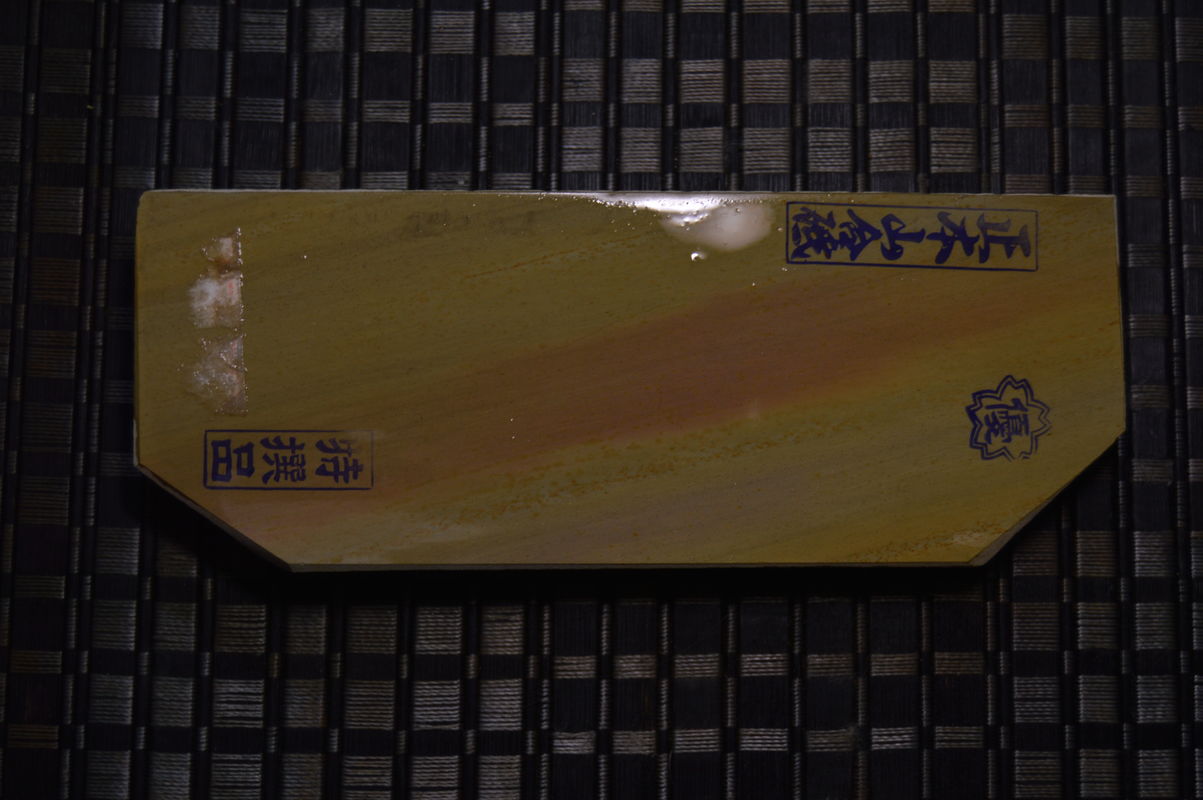 Re: Продаётся от artemarut1 Распродажа страницы №1Spoiler Show Японский камень, цвет солнечный (Иромоно), твердость около 4+ очень тонкий финишный камень, использовать лучше всего последним в сете, суспензию добровольно не дает, но очень легко выжать с помощью нагуры. Такой тип камней можно использовать без сета нагур, достаточно одной более твердой чем сам камень. Нет каких либо царапающих включений, линия на камне исключительно цветовая, обработан против расслаивания (бока и низ, некоторое время камень был в моем рабочем сете). Размер в максимуме 167/83/27мм Цена Продан Spoiler Show