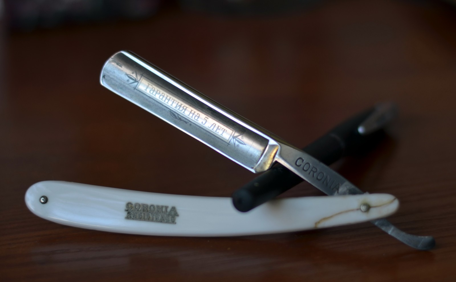1) немецкая бритва Coronia, изготовленная известной немецкой фабрикой August Muller из города Solingen. Выполнена по спецзаказу для одной из прибалтийских стран в 20-е годы (а возможно и Финляндии). Поскольку выпуск этих лезвий был ограничен в количестве и во времени, то бритва эта представляет определенную ценность для коллекционера