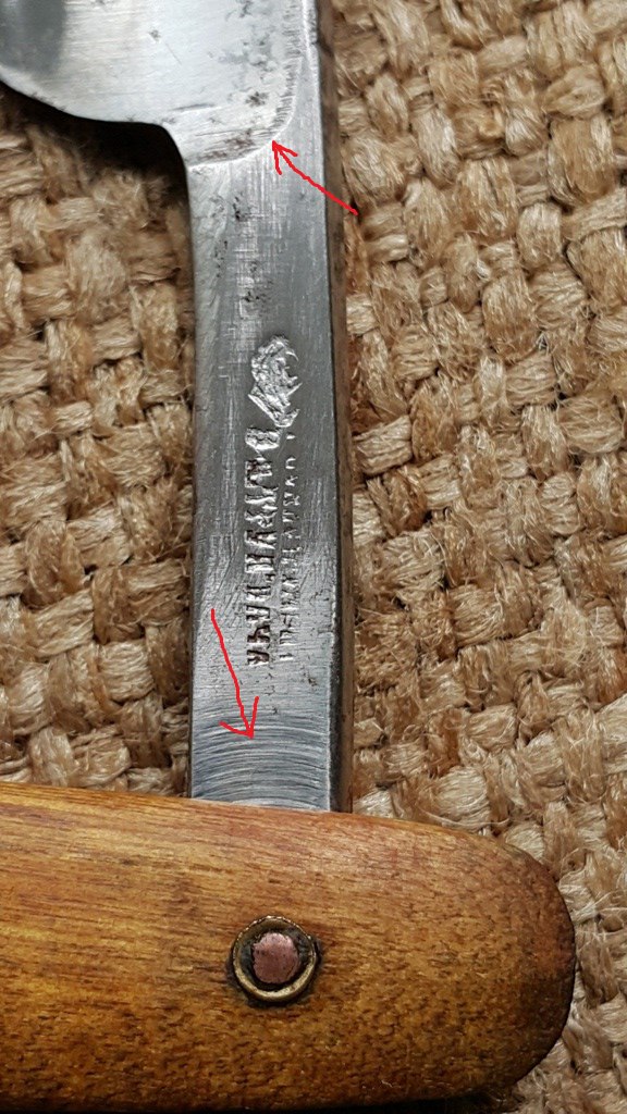 Раздобыл довоенную Вачу в деревянной оправе, штамп "Росинструмент З-д Труд Вача", без указания года, т.е. изготовлена до 1940 года, если я правильно понял. Следов заточки и пользования не обнаружил. Вроде как в первозданном виде, но по металлу не идеал))) Металл и частично дерево были замазаны солидолом. На стали есть пятна и коррозия, в том числе на рабочей кромке. Оправа без видимых дефектов, клинышек в одном месте не очень аккуратно сделан. Штамп отбит не очень четко, верхняя строчка угадывается, вторая читается. Пины родные, медь + окантовка латунь (видимо). Клинок входит в оправу штатно, без закусываний. Осевой пин достаточно плотно сидит. Бритва без футляра.