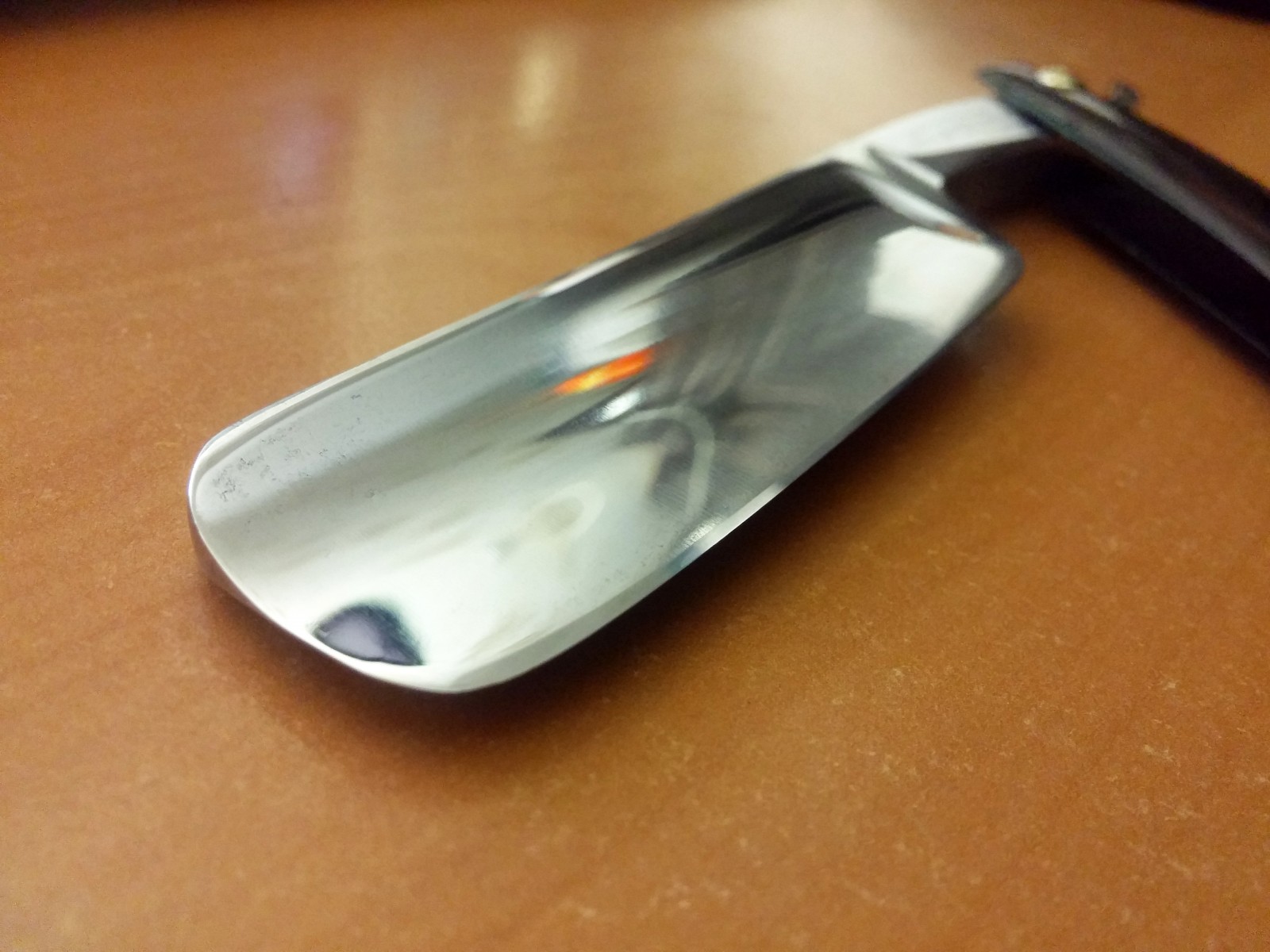 Бреет превосходно - очень комфортно и легко! Форма полотна очень удобная, легкая правильная улыбка способствует гладкому бритью, закругленная форма носика с режущей кромкой позволяет выбрить углубления шеи под определенным углом. Большой вес бритвы дает ощущение, что она бреет сама, практически без усилий. Сталь не сильно жесткая.