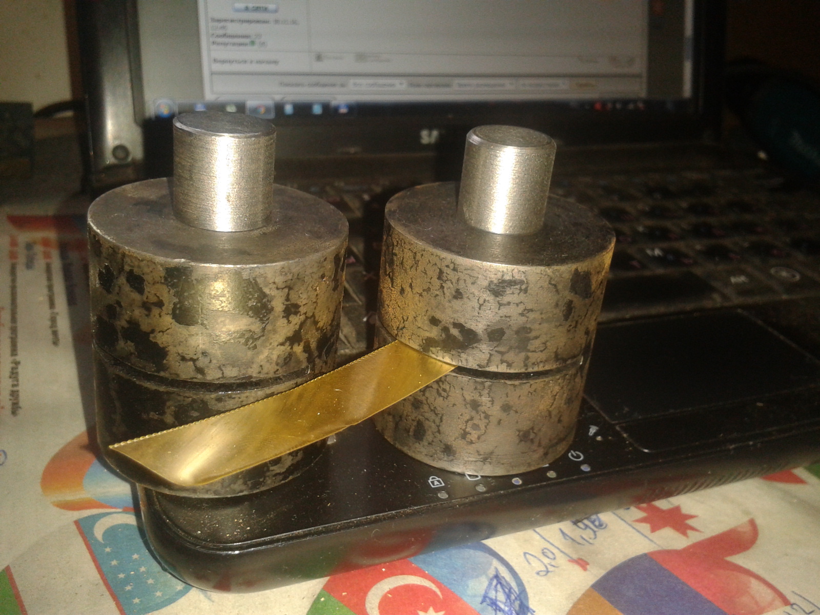 Re: Моя первая ручка. Заценитеу меня две такие приспособы. одна для наружных, вторая для внутренних шайб (в скобках размер для приспособы номер два, высекающей внутренние шайобочки). Берем полоску нейзильбера ( или др. подходящего материала толщиной 0,4 мм.... для нержи 0,3 - чтобы не мучить пуансон))). Сверлим в нейзильбере дырдочки на 1,5 мм (через 5 мм). Вставляем в приспособу, центруем пуансон в просверленное отверстие (для этого на пуансоне есть кондуктор, на говночертеже видно (такая пимпочка на конце маленькая)... Так вот, эта пимпочка проваливается в отверстие в нейзильбере... все, осталось только дать сверху молотком... Бах!!!! Снизу вываливается шайба... с дыркой... слегка сферическая уже.... Передвигаем пластину на следующую дырочку, и так пока дырочки не кончатся.... Далее, надеваем получившуюся шайбочку на заточенный конусом пруток... на конус шайба садится весьма плотно... пруток в шуруповерт... и на 1000 наждачке начерно полируем шайбу - плоскость, торцы... Не забываем подложить под лист наждачки чёнить мягонькое, пористую резину толщиной 5-6 мм, например... Это дает удобство в обработке шайбы, наждачка как бэ "обтекает" шайбочку, сферическую поверхность шайбы по другому обработать тяжко будет.... Снимаем с прутка и сверлом на Ф2 зенкуем внутреннее отверстие... не забыв поставить шурика на реверс, чтобы невзначай не просверлить тоненькую шайбу нафиг... Обратно шайбочку на конус и на 3000 наждачке полируем начисто до блеска котовьих яиц... Готово!!! Для внутренних шайб - латунька 0,1 мм... ну с ними проще - бахнул молотом и готово))))..... Как то так..... Повторяемость изделия изумительная, внешность - сияющая, сходство со стоковыми шайбами 99%))))))))).... Надеюсь, сие творчество кому-нибудь, да будет полезно