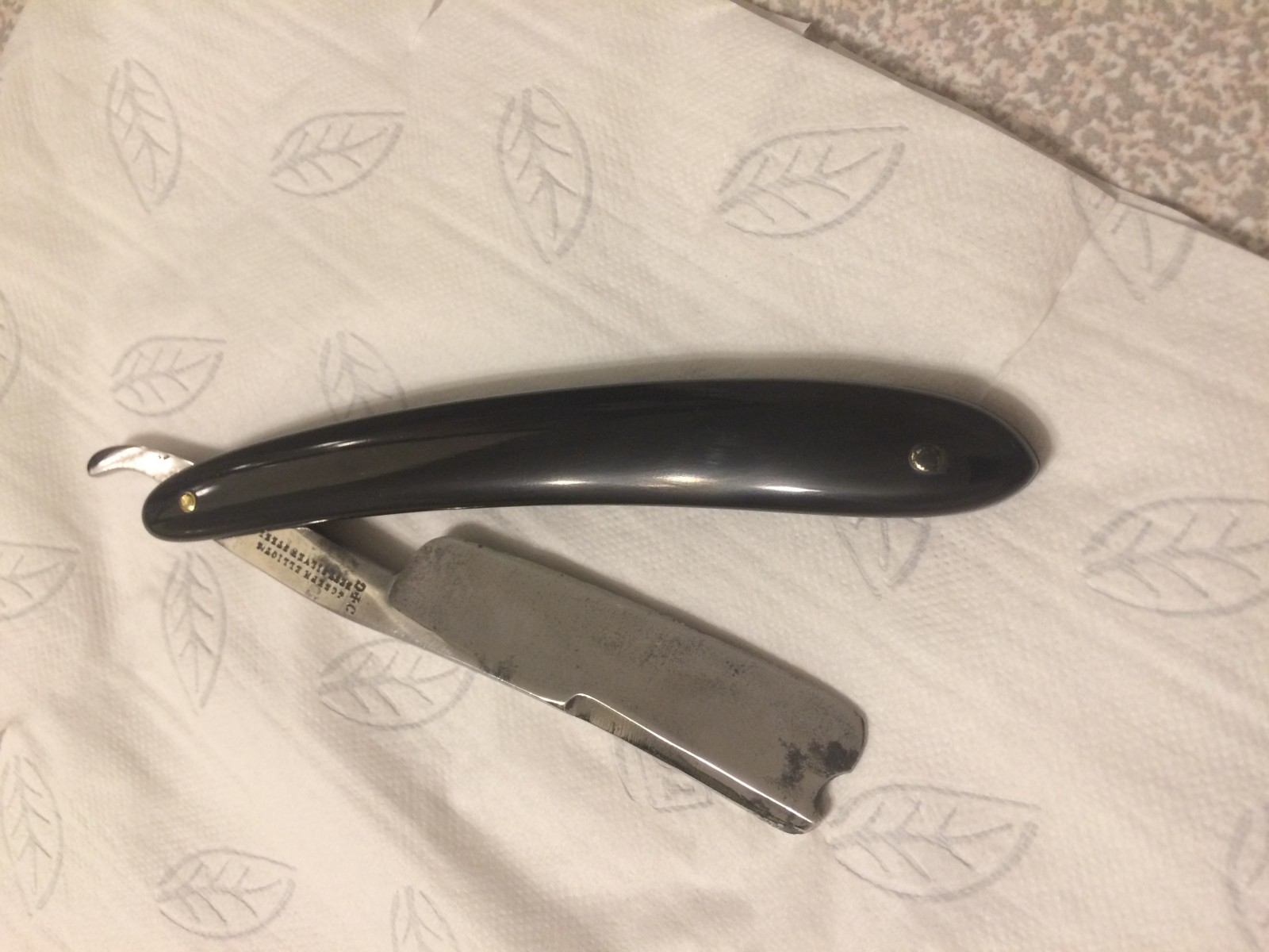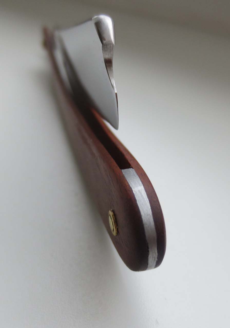 Француз бесхвостый DOMMANGET. По всей видимости 19-й век.Под осевым пином был ещё один штамп, но забыл сделать фото. Родная роговая оправа, в идеальном состоянии.. Родные стальные пины удалось сохранить и снова поставить. Только внутренние шайбы установил дополнительно. Очень приятная бритва и достаточно тяжёлая. Кромочка получилась очень ровная, на удивление. Патину в районе эрля не стал убирать, чтобы не стереть до конца штамп. Он и до реставрации плохо просматривался.. до Spoiler Show Spoiler Show Всё будет ХОРОШО...тел:+79065827134