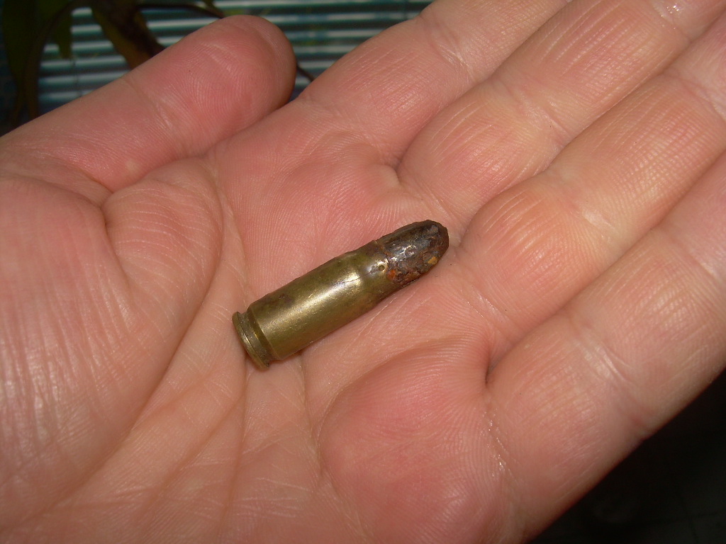 ну это друг детства, просто на память. Выкопал где-то горсть таких. Военная реликвия. Когда на форуме старые ржавые бритвы взрослые мужчины друг другу дарят, при этом зачастую даже не знакомые между собой в реальном мире - это тоже может показаться странным, но я же своего раздражения и возмущения не высказываю. Длина (с учетом ржавчины) примерно 35 мм, диаметр гильзы возле капсюля где-то 8-9 мм, диаметр пули возле входа в гильзу, опять-таки с учетом ржавчины - около 7,5-8 мм. Длина гильзы примерно 25 мм. 7,62 калибр, что ли? На гильзе возле капсюля какие-то буквы, но разобрать их из-за следов времени сложно.