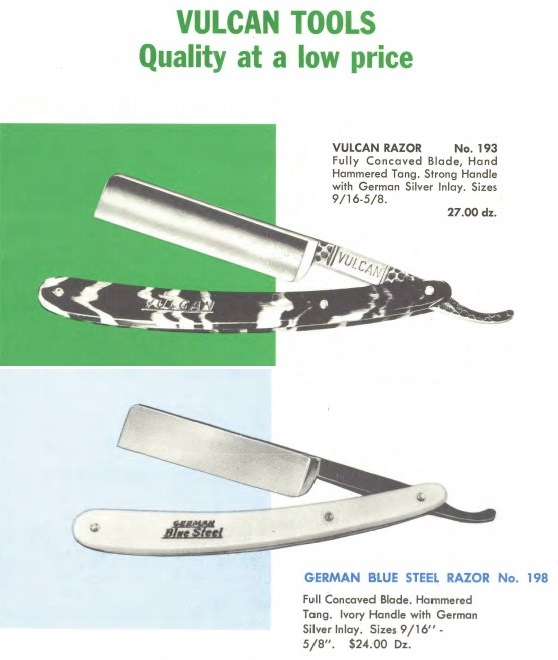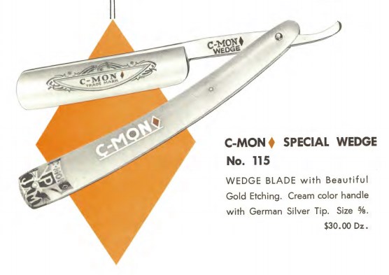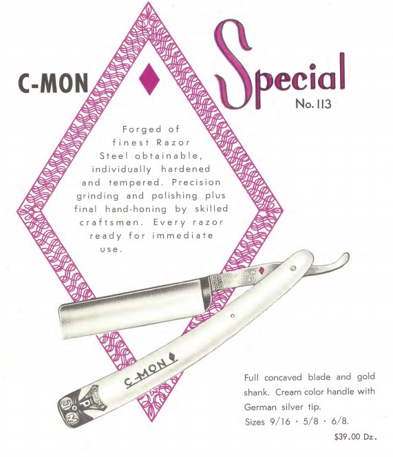 Вот тут лежат три ежегодных каталога фирмы Peter J. Michels, дистрибьютора инструментов для салонов красоты и парикмахерских за 1953, 1954, 1963 годы. Каталоги номерные, номер 40, 41 и 50. Значит фирма работала все эти годы и, не нарушая нумерации, выпускала каталоги. скопировал все бритвы от туда: 1953 год Spoiler Show Spoiler Show 1963 год Spoiler Show Spoiler Show 1953 год C-MON - ROYAL № G100 размеры 9/16, 5/8, 6/8 Made in Germany - SUPER XX № G101 размеры 9/16, 5/8, 6/8 Made in Germany - SPECIAL № G113 размеры 9/16, 5/8, 6/8. Made in Germany - BLACKIE № G110 размеры 9/16, 5/8, 6/8. - HF (Hand Finished) № A111 размеры 9/16, 5/8, 6/8. Made in Germany - DELUXE № A112 размеры 9/16, 5/8, 6/8. - WEDGE № A114 размеры 9/16, 5/8. - GOLDIE № A115 размеры 9/16, 5/8, 6/8. A.I.C. - № 12, размер 6/8 - № 23, размер 6/8 - № 34, размер 9/16, 6/8 - № 45, размер 9/16, 6/8 MERIT - № A613, размер 9/16, 5/8. PRESTO - № G913 размер 5/8 SPEAR - № A713, размеры 9/16, 5/8, 6/8. - № G713, размеры 9/16, 5/8 TRU-EDGE - № G812 DELUXE размер 5/8 - № G813 SPECIAL размер 5/8 1954 год C-MON - SPECIAL № G113. размеры 9/16, 5/8, 6/8 - BLACKIE № G110 размеры 9/16, 5/8, 6/8 - SUPER XX № G101 размеры 9/16, 5/8, 6/8 - ROYAL № G100 размеры 9/16, 5/8 - H.F. № G111 размеры 9/16, 5/8, 6/8 - WEDGE № G114 размеры 9/16, 5/8 MERIT - № 613, размер 9/16, 5/8 SPEAR - № G713, размер 9/16, 5/8, 6/8. TRU-EDGE - DELUXE № G812 размер 9/16, 5/8 - SUPERBE № G813 размер 9/16, 5/8 1963 год C-MON - CADILLAC № G105. размеры 9/16, 5/8, 6/8 - BLACKIE № G110 размеры 9/16, 5/8, 6/8 - SPECIAL № G113. размеры 9/16, 5/8, 6/8 - HF № G111 размеры 9/16, 5/8, 6/8 - SUPER XX № G101 размеры 9/16, 5/8 - WEDGE № G114 размеры 9/16, 5/8 - Special WEDGE № 115 размеры 5/8 MERIT - № 613, размер 9/16, 5/8 SPEAR - № G713, размер 9/16, 5/8, 6/8 TRU-EDGE - DELUXE № G812 размер 9/16, 5/8 - SUPERB № G813 размер 9/16, 5/8 VULCAN № 193 размер 9/16, 5/8 GERMAN BLUE STEEL № 198 размер 9/16, 5/8 Re: Peter J. Michels, Brooclyn NY, Germany - Spear brandОсновная их торговая марка после 1945 года была, оказывается, вовсе не колокол со стрелой, а C-MON.