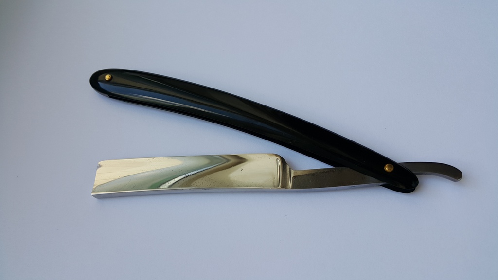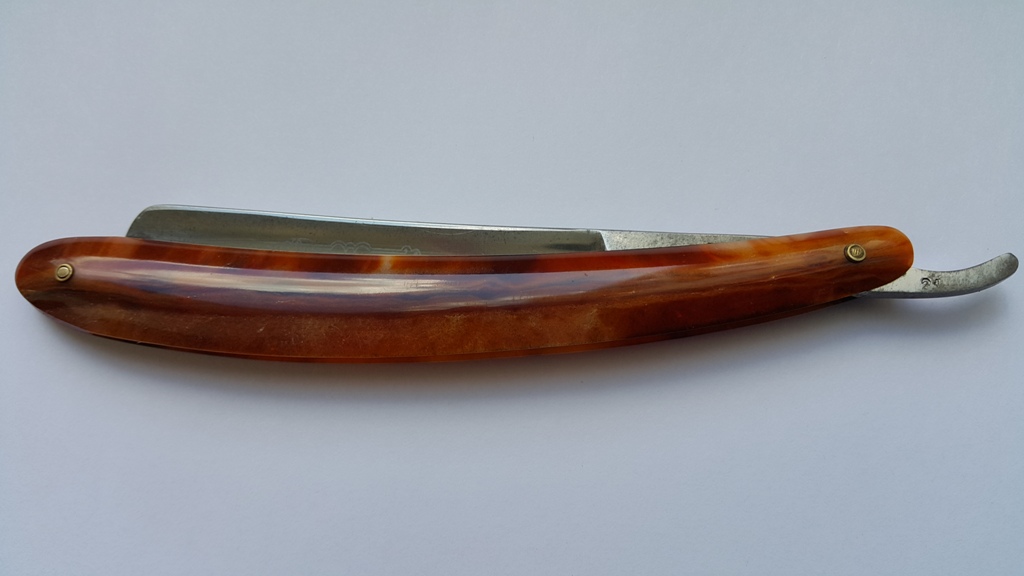 Бритва полностью в рабочем состоянии. Ручка целая, ровная, клинок паркуется по центру, без закусываний. На осевом пине сидит достаточно плотно, под собственным весом не вываливается. Парковка сделана утыканием носика бритвы в клинышек ручки. Насечка с двух сторон эрля. Длина рабочей кромки 8 см. Длина ручки 15 см, длина клинка 14,5. Обух 5+ мм. Увесистая бритва, 54 грамма.