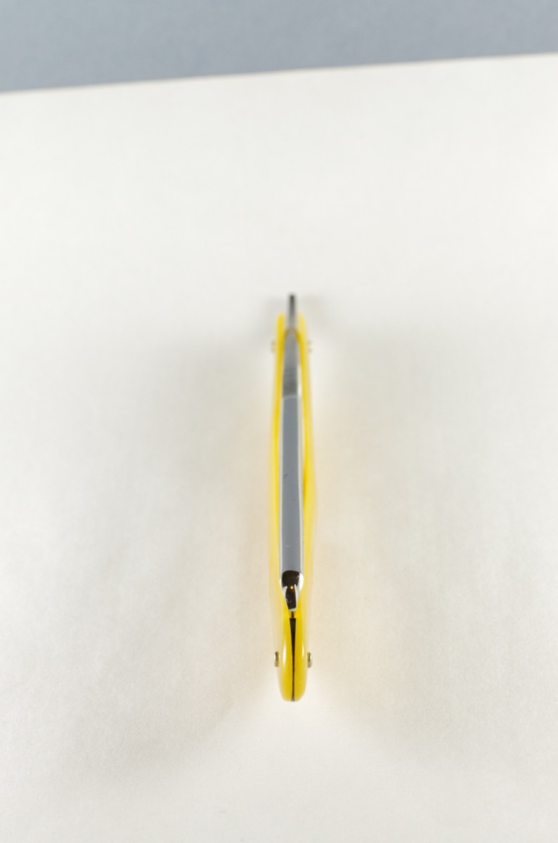 Клинок паркуется в ручку штатно, без перекосов и закусываний, на осевом пине сидит плотно, под собственным весом не вываливается. Видны установленные внутренние шайбы на осевом пине.