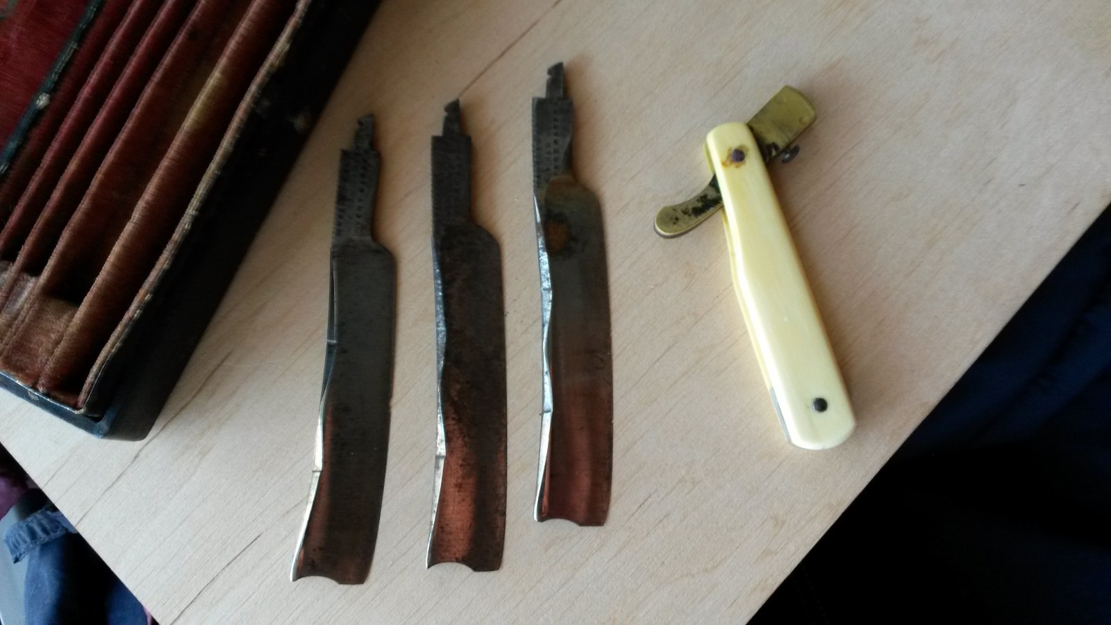 5, это точно, а возможно и 6 бритв совершенно непользованные были. Одна немного б.у., но тоже в прекрасном состоянии. Что удивительно, ручки из слоновой кости были все целы(за исключением одной),без трещин и сколов. Разобрал наборчик, немного освежил металл, где это было необходимо. В основном полотно не трогал, а почистил в районе осевого пина. И снова аккуратно собрал. За все время работы не расколол ни одной ручки, а ту ручку,что была с трещиной, хорошо проклеил с обеих сторон и отполировал. Коробочка из красного дерева также в отличном состоянии для своих лет. Пины двухцветные от нашего немецкого комрада Бабура. Короче, замечательный, редкий экземпляр.. Полюбуйтесь.. Добавлено спустя 40 секунд: Ещё фото... Всё будет ХОРОШО...тел:+79065827134